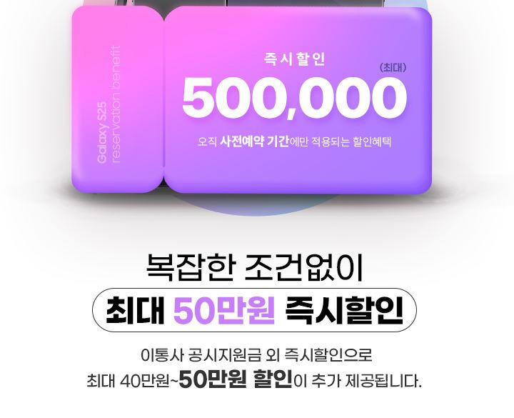 갤럭시 S25 사전예약 기간은 1월24일(금)~2월3일(월) 까지 진행하지만, 성지에서 제공하는 즉시할인 혜택과 워치 무료개통은 더욱 빠르게 마감될 확률이 높습니다.