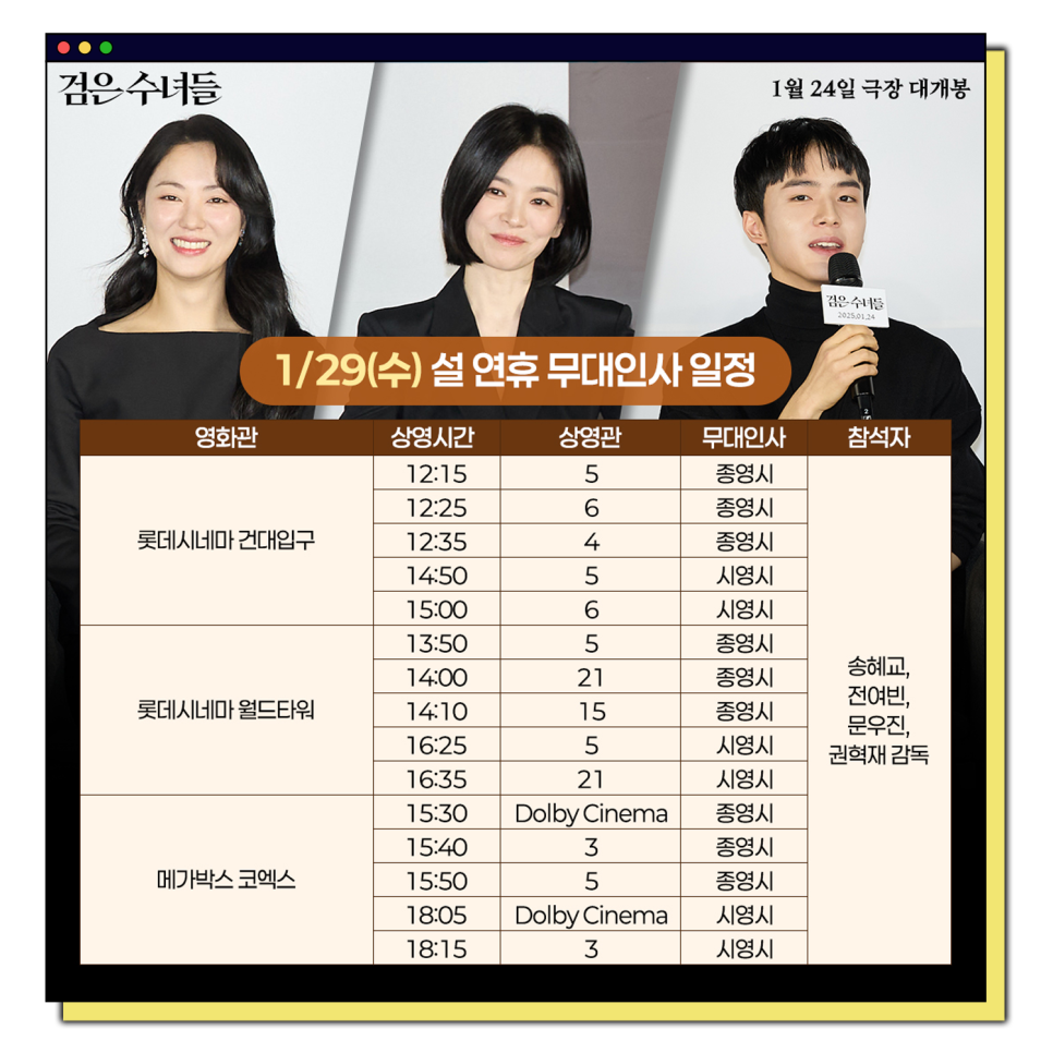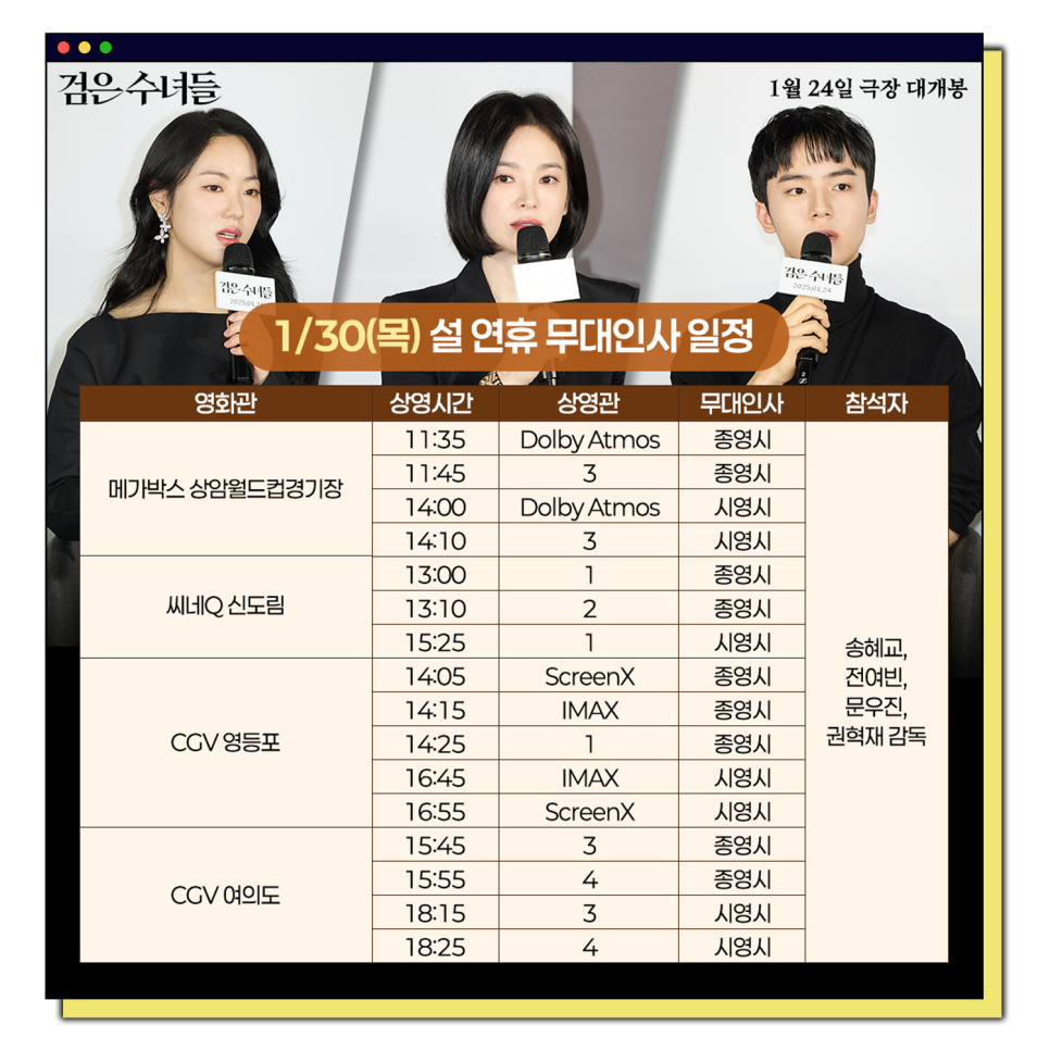 극장가를 뜨겁게 달굴 1월 영화입니다. 그래서 개봉주부터 있을 예정인데요. 먼저 25일(토)에는 영등포와 용산아이파크몰에서 일반관은 물론 IMAX와 ScreenX까지 시영시와 종영시 진행됩니다. 주연을 맡은 송혜교를 비롯해 주역들 그리고 감독까지 참여합니다.