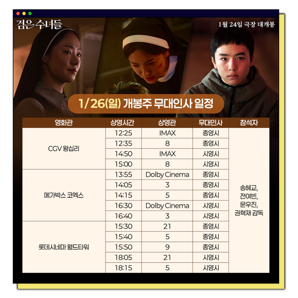 이번 포스팅에서는 검은수녀들 개봉을 맞이해 두 배우가 참석할 무대인사에 대해서 살펴보겠습니다.