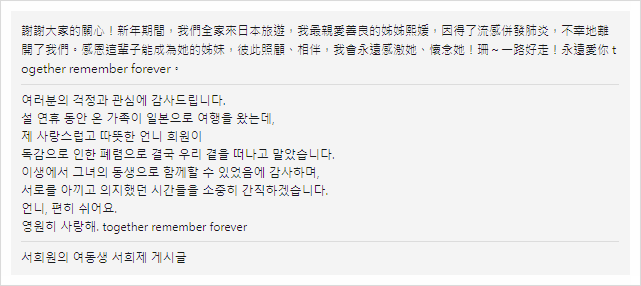 내용인즉슨 "설 명절 기간 동안 우리 가족은 일본으로 여행을 갔다. 나의 가장 사랑하는 언니 희원이 독감으로 인한 폐렴 합병증으로 안타깝게도 우리 곁을 떠났다"며 "이번 생에 그녀의 동생으로 함께하며 서로 돌보고 의지할 수 있었던 것은 내게 큰 축복이었다. 영원히 감사하며 깊이 그리워할 것이다. 부디 평안히 쉬길 바란다. 영원히 사랑하고 기억하겠다"이다.
