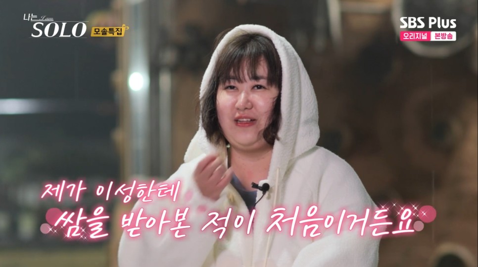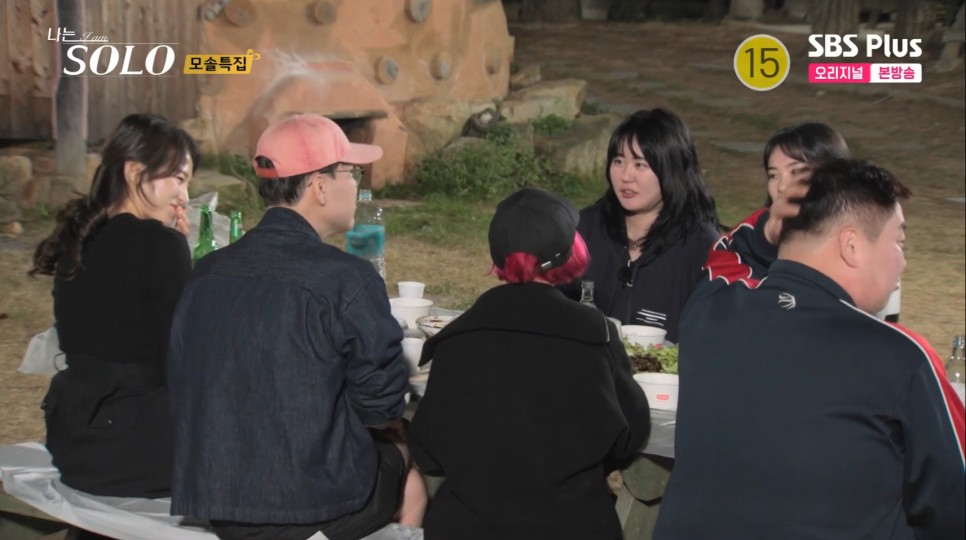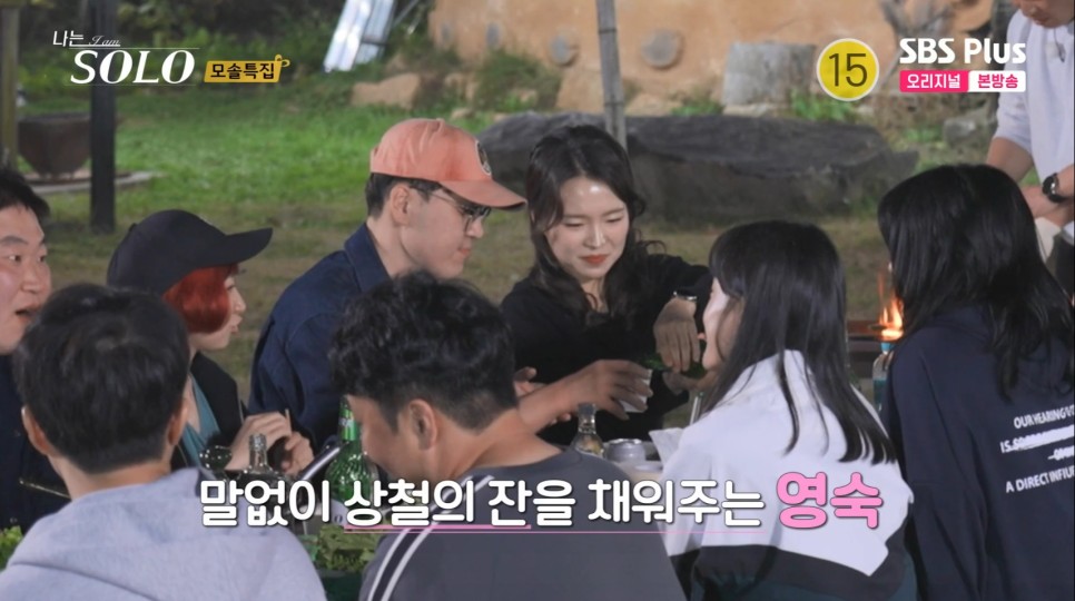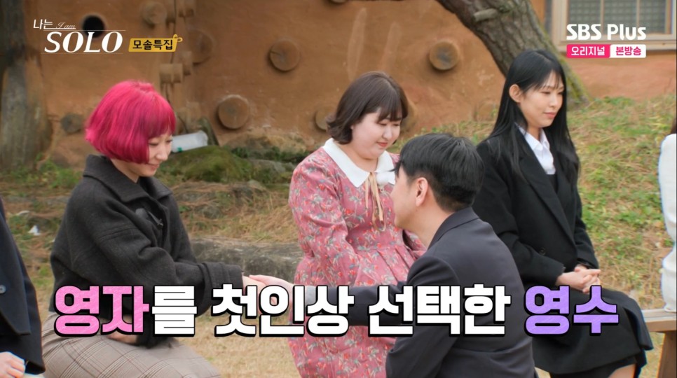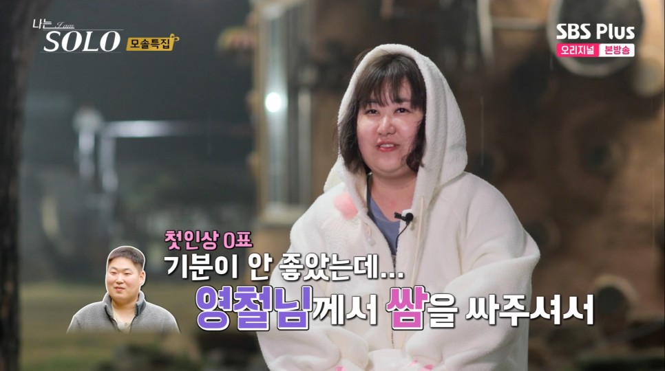 그리고 사랑이 싹트는 식사자리에서 정숙이 좀 손해를 봅니다... 하필 끝자리에 앉아서... 별다른 말을 못 합니다.. 앞에 사람이 있음에도 말을 잘 안 하는 거 보면 역시나 모태솔로...라는... 생각이 들더군요. 그래도 적극적인 영철이 정숙 옆에서 조용히 있는 순자한테 말을 걸며 분위기를 풉니다. 순자한테 쌈까지 싸주는 영철입니다. 0표 받아서 기분 안 좋은 순자를 알뜰하게 챙겨줍니다. 이렇게 쌈을 싸주면... 썸이라 오해하게 됩니다. 분위기가 너무 조용해서 풀려고 싸준 영철인데 이걸 썸으로 생각하는 순자입니다. 쌈 하니 또 베이비영철이 떠오르네요...