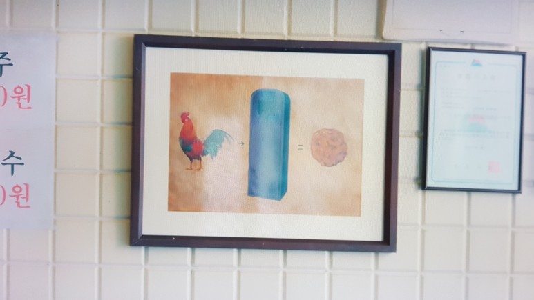 *그럼 회사에 기계를 가져다 놓은 사람은 누구일까? 그는 양반댁 사장입니다. 앙반댁 사장은 근처 잘나가는 백정 강정집에 따지려 갔는데 그 가게 액자에서 익숙한 기계를 보게 됩니다. 바로 자신이 가지고 있던 캐비넷이었습니다. 그곳 직원에게 이 그림이 뭐냐고 묻자 기계에 닭을 넣으면 닭강정이 나온다고 말을 하며 아냅니다.