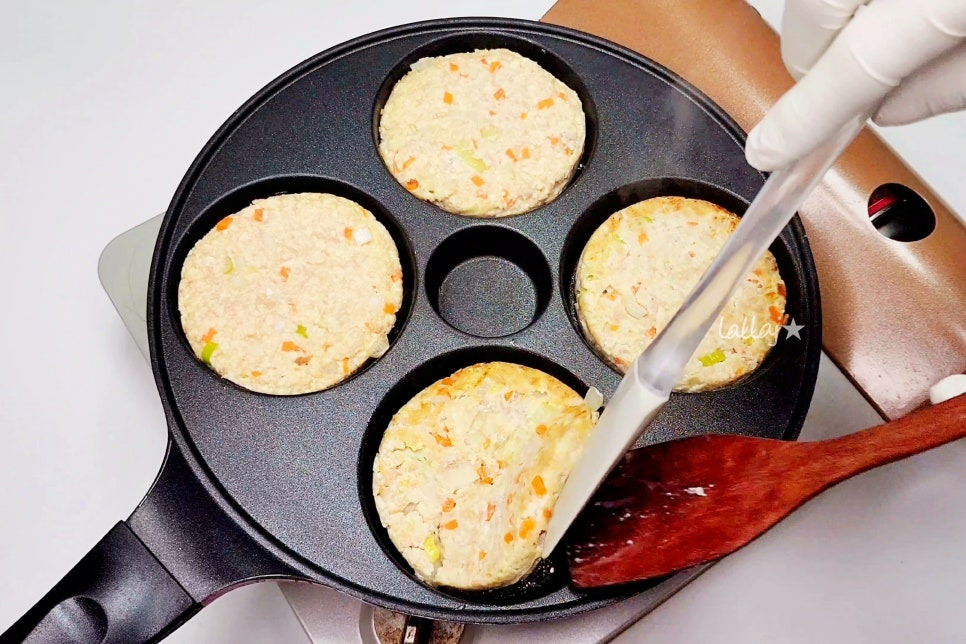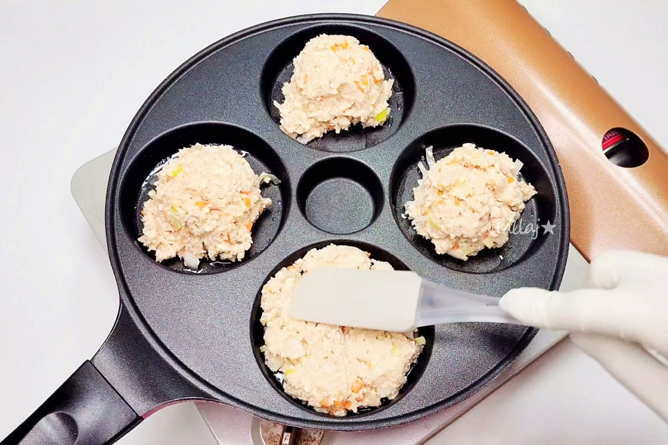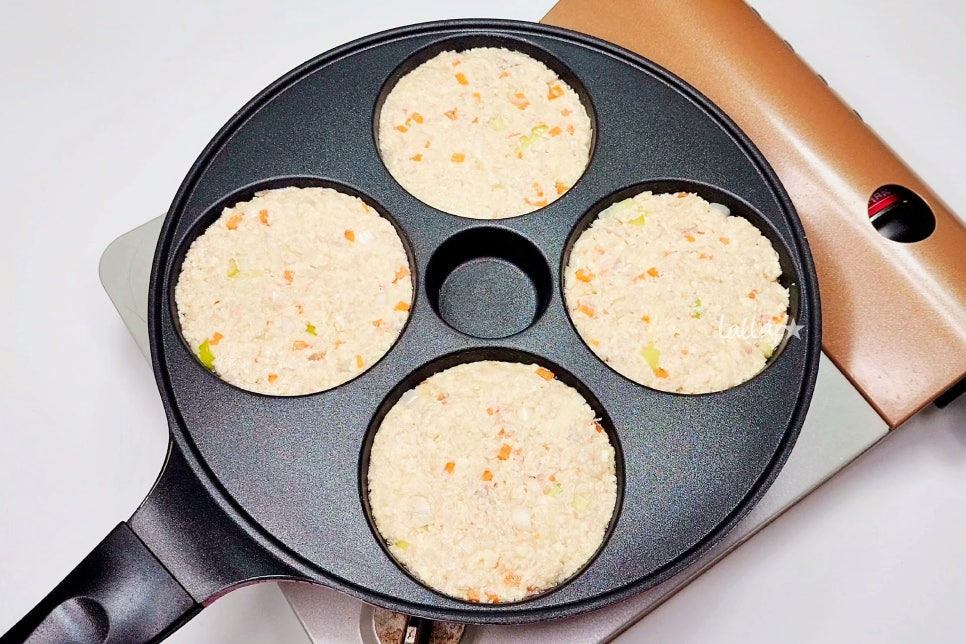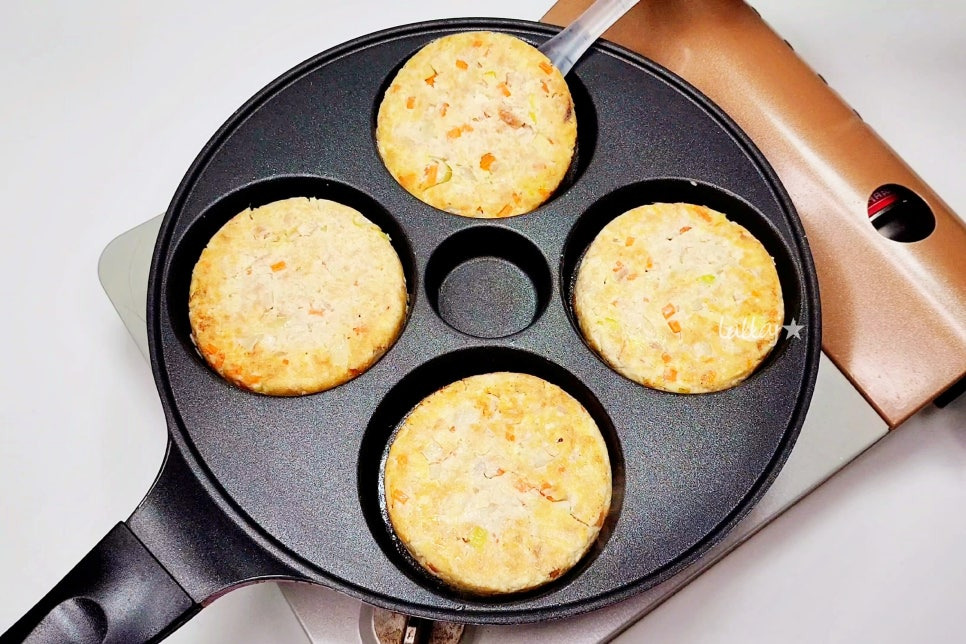 팬에 포도씨유를 조금 두른 후 반죽을 비슷한 양으로 올려주세요. 저는 아이스크림 스쿱을 사용했는데 딱 좋더라고요^^ 에그팬이 없다면 일반 프라이팬에 구워도 되고요. 크기가 너무 크면 뒤집을 때 찢어질 수 있으니 작은 사이즈로 만드는 게 좋아요~