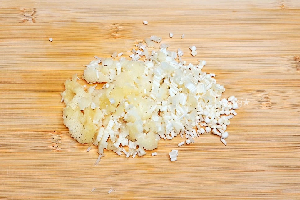 양파 1/4개와 대파 흰 부분만 1대, 채 썬 당근 반 줌, 팽이버섯 반 봉지를 준비해서 모두 잘게 썰어주세요. 여기에 약간 매콤하게 청양고추를 넣어도 맛있어요~