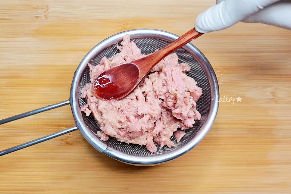 중간 크기 참치 1캔도 체에 밭쳐서 꾹꾹 누르면서 기름기를 제거하고요. 참치양은 조절해도 돼요~