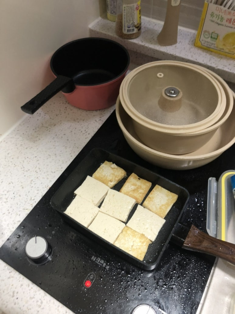 두부 한꺼번에 작은 프라이팬에 올리지 않기 ... 두부가 생각보다 잘 안구워지더라고요