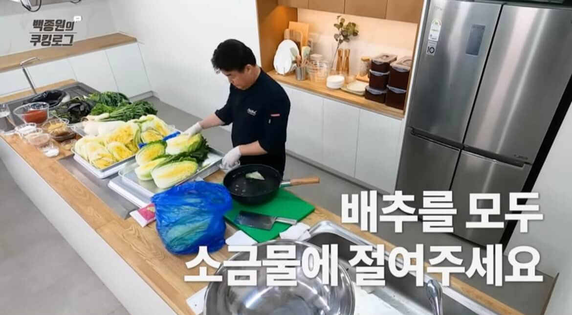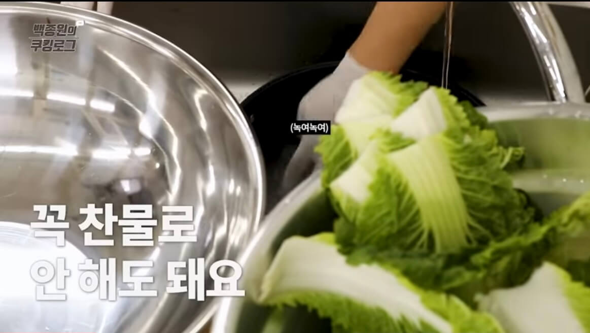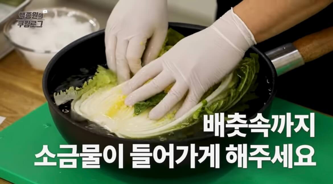 - 천일염으로 문질러 둔 배추를 소금물에 담가 골고루 묻혀줍니다