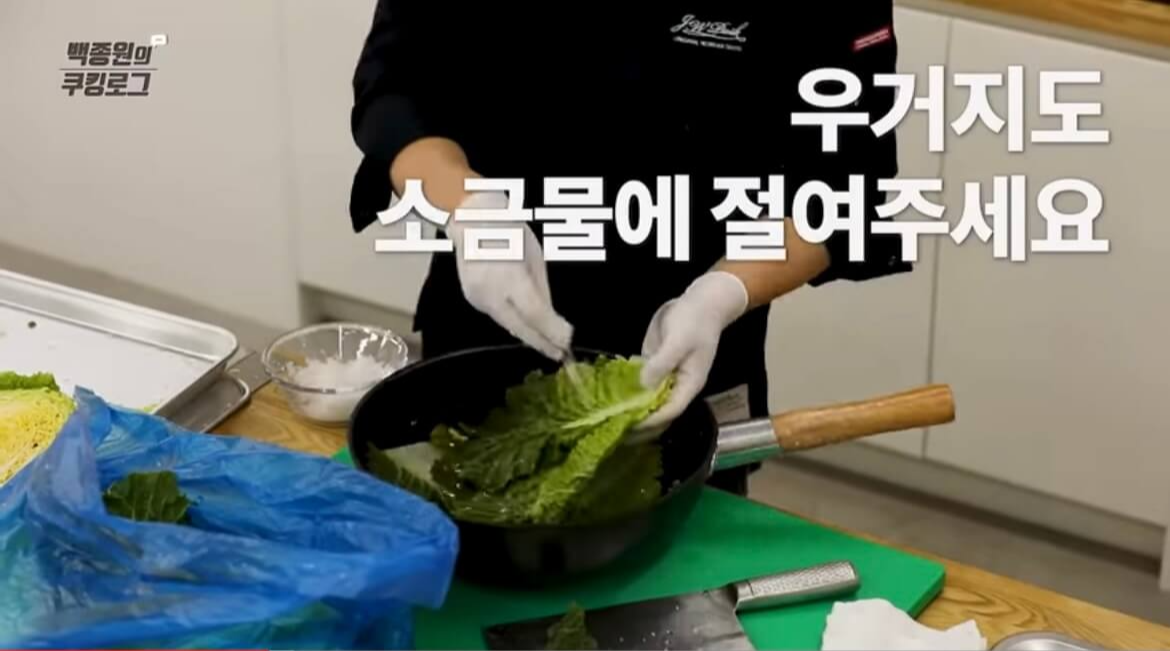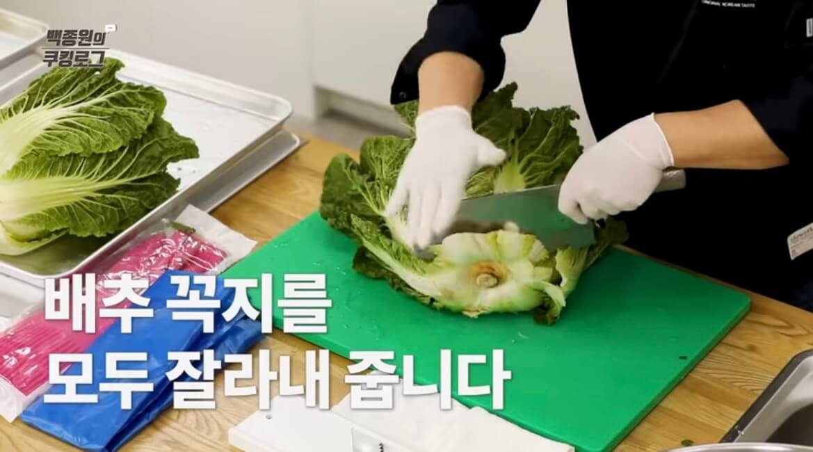 - 배추는 밑동을 잘라내서 겉잎을 뜯어냅니다.