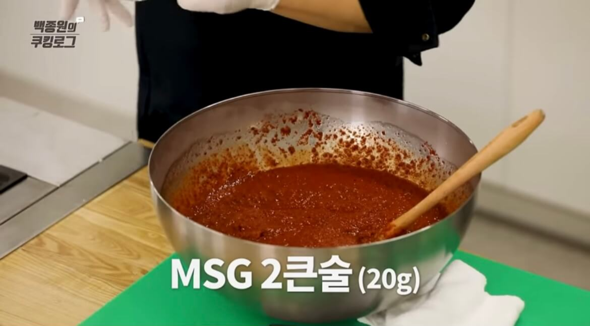 - 찹쌀 풀의 농도가 잡히면 고춧가루와 MSG를 넣고 섞어줍니다.