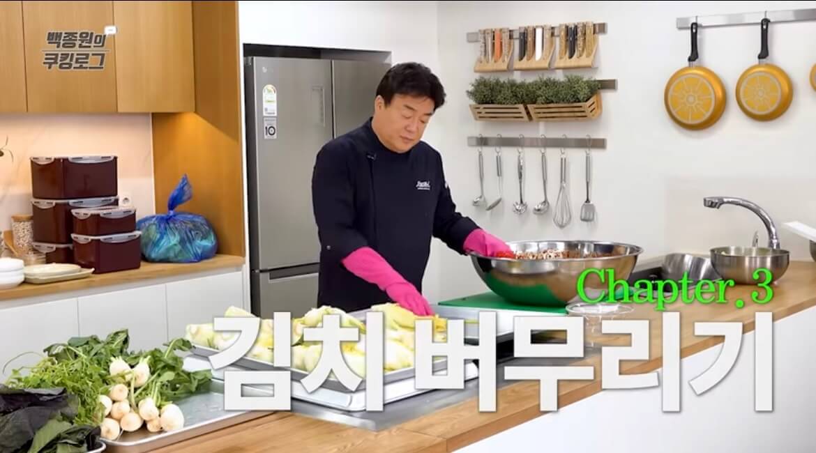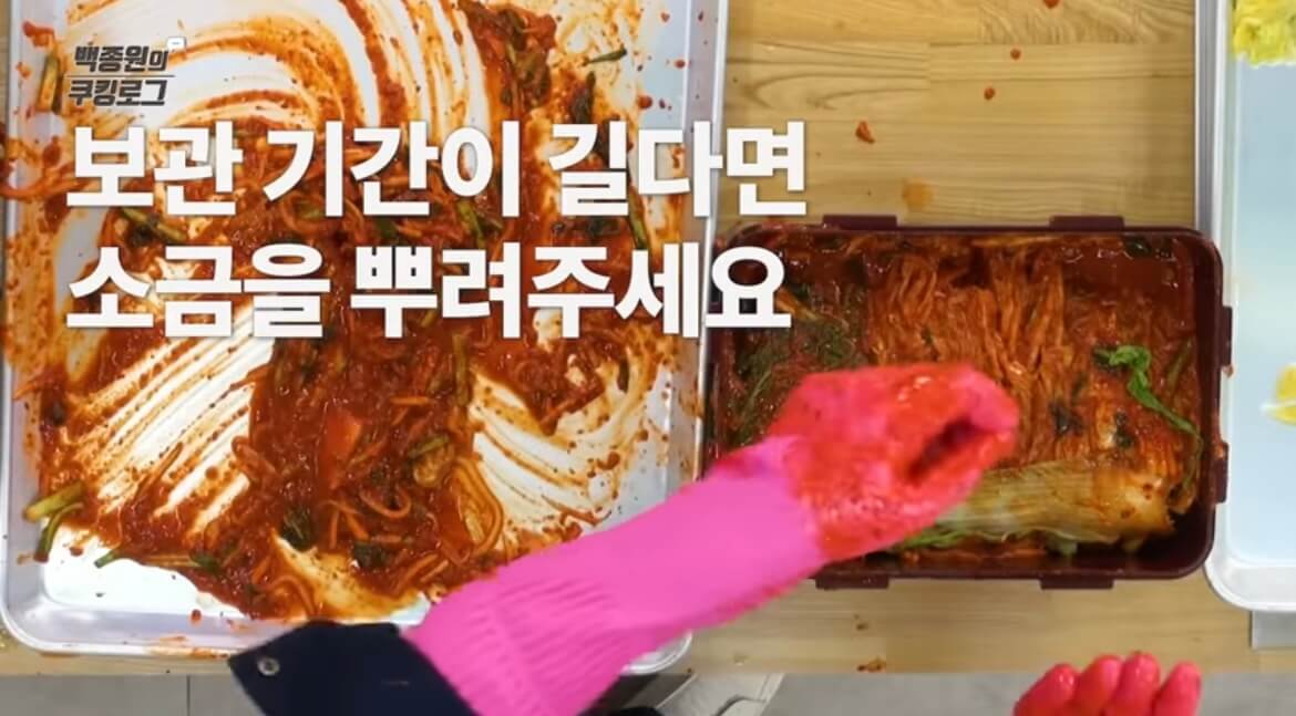 - 김치통이 채워지면 남은 절인 배추 이파리로 김치를 덮어 보관합니다.