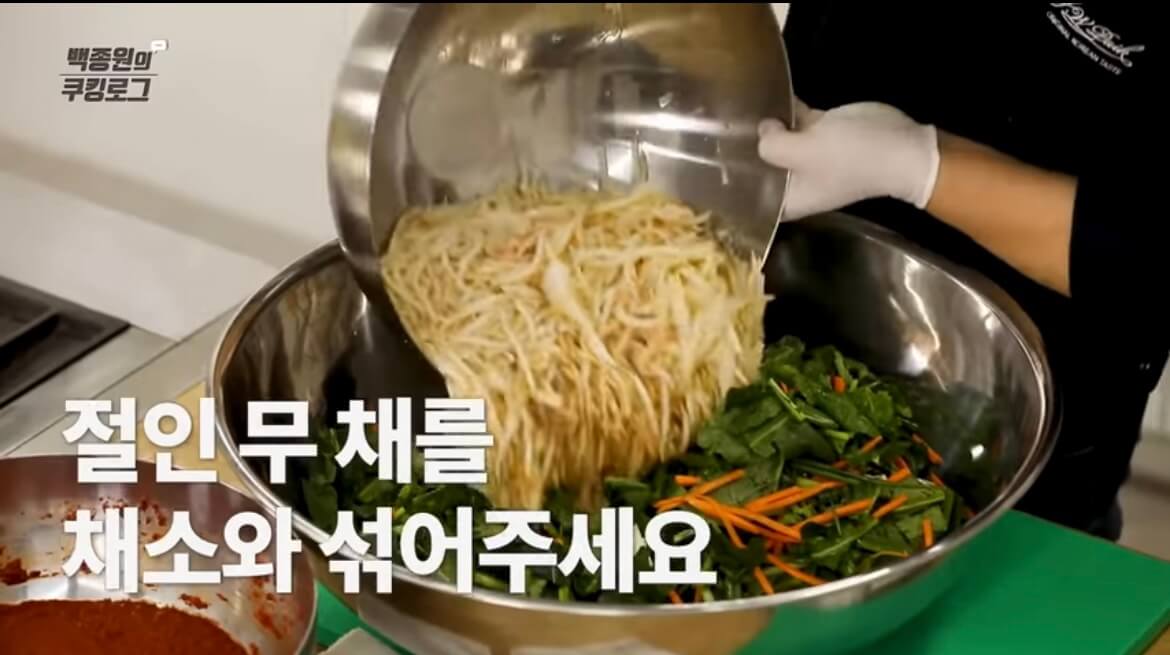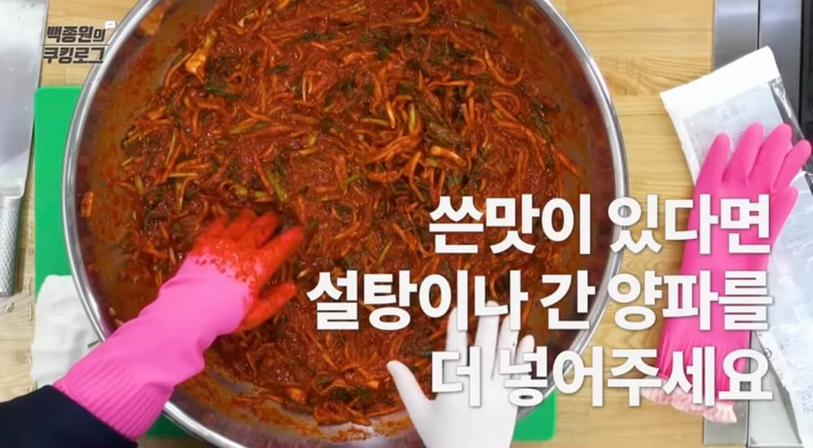- 손질해 둔 채소에 절여둔 무, 불린 고춧가루, 간 마늘, 한 생강, 황설탕을 넣어줍니다.