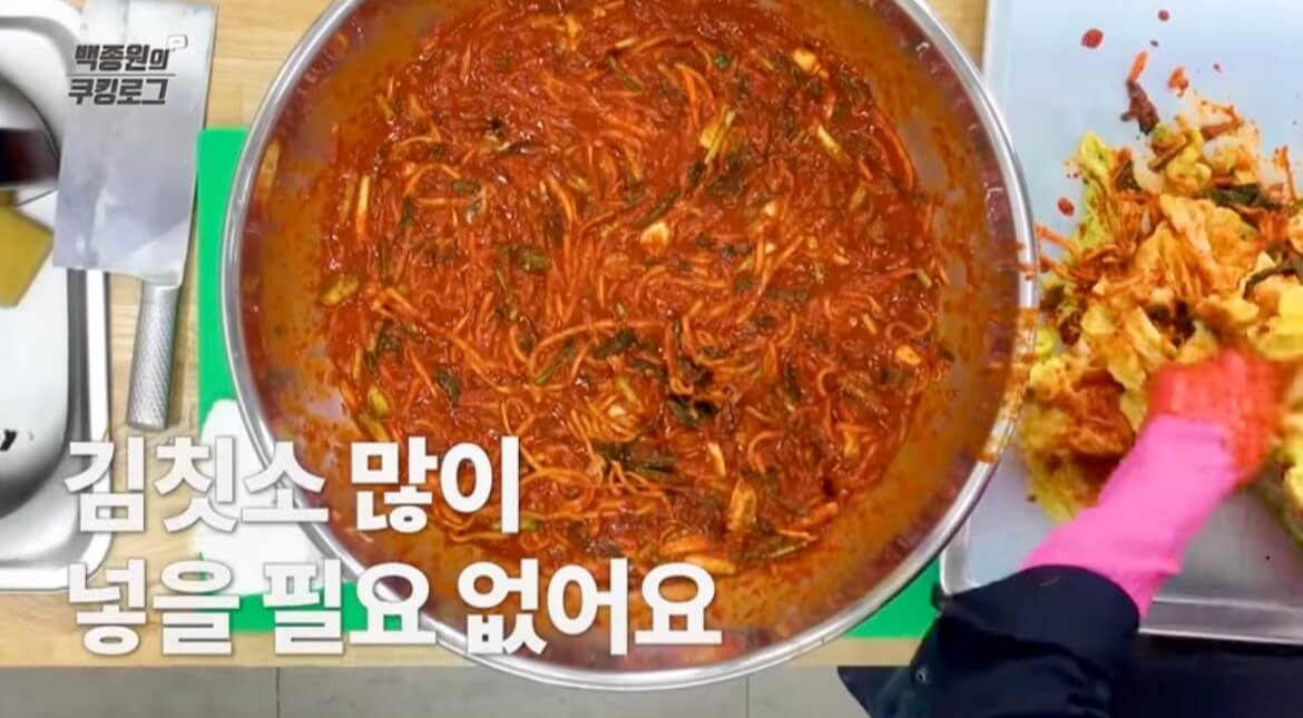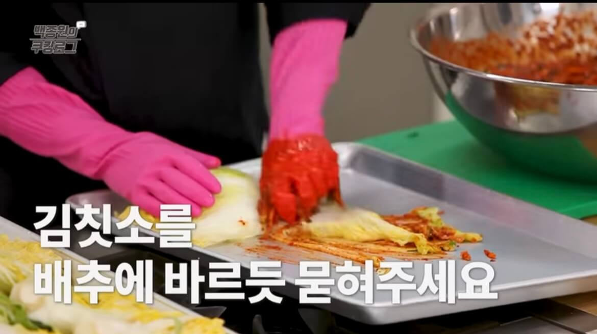 - 절인 배추에 김칫소를 한 장 한 장 얇게 발라줍니다.