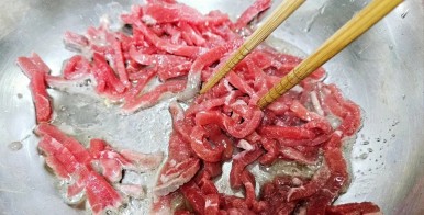 (2) 밑간해 둔 소고기를 넣고 중불에서 볶아 주세요.