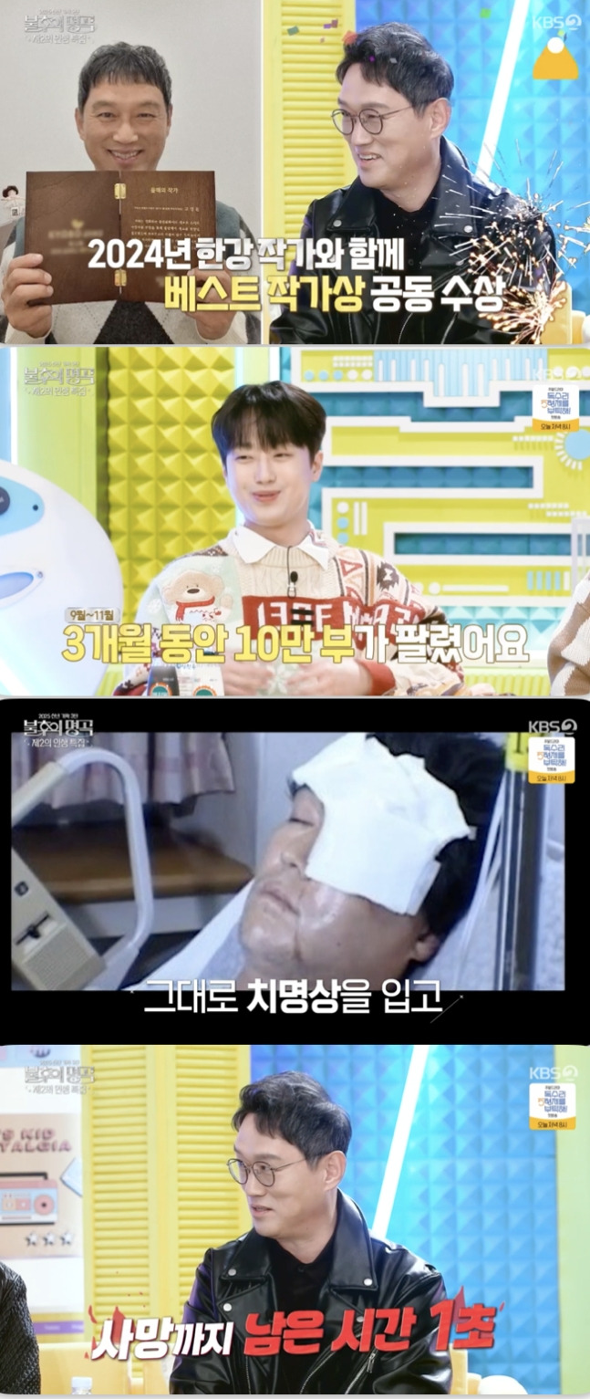 한편 고명환은 작가로 전향 계기를 묻는 질문에 2005년 큰 교통사고를 당하며 병원에서 1초 후 사망한다는 이야기를 듣고, 진단명을 내려 주기도 전에 유언부터 남기라는 말을 들었다고 털어놓았습니다.