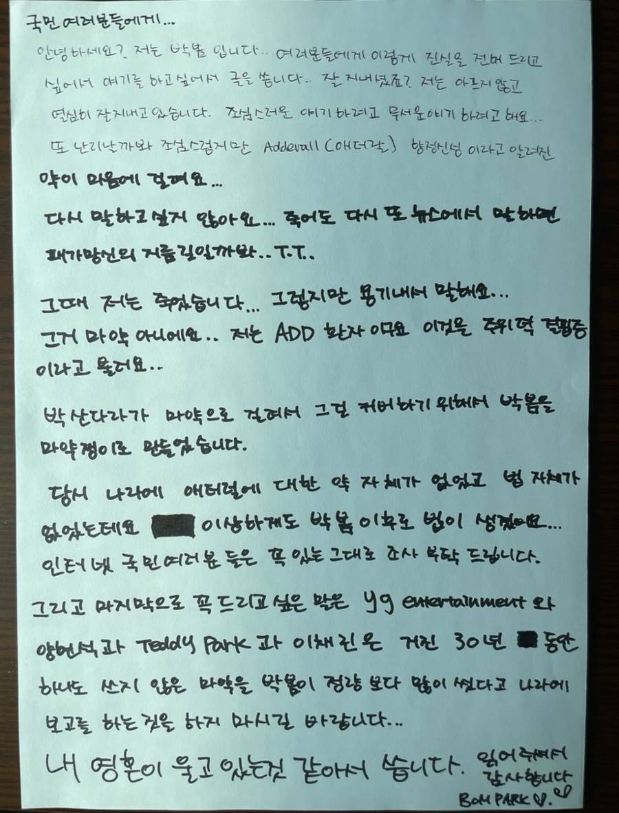 박봄은 최근 자신의 SNS에 장문의 손글씨로 쓴 글을 올리며, 과거의 마약 논란에 대해 해명했습니다. 그녀는 "그건 마약이 아니다. 나는 ADD(주의력결핍증) 환자"라고 주장하며, 당시 상황을 재차 해명했습니다. 이 발언은 많은 이들에게 충격을 주었고, 특히 같은 그룹의 멤버인 산다라박과의 관계에 대한 의문을 불러일으켰습니다.