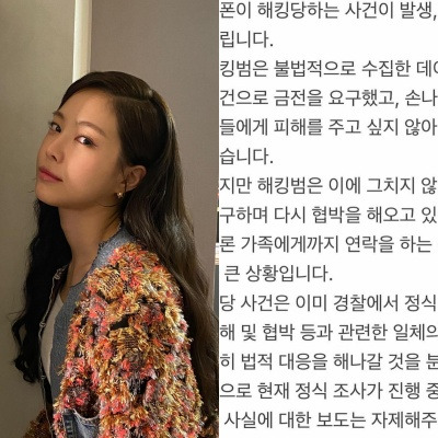 조금 전 손나은의 인스타에는 최근 손나은의 개인 휴대폰이 해킹당하는 사건이 발생했고, 해킹범은 불법적으로 수집한 데이터를 공개하지 않는 조건으로 금전을 요구했다는 글이 게재되었는데요.