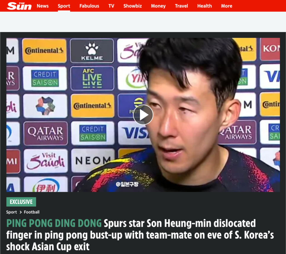 영국 매체 더선이 "토트넘의 스타 손흥민이 한국 대표팀의 아시안컵 준결승 전날 저녁 식사 자리에서 동료들과 언쟁을 벌이다 손가락 탈구 부상을 당했다"라는 기사를 실었습니다.