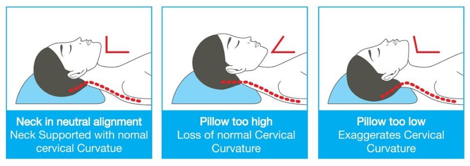위 사진을 통해 알 수 있듯이 베개가 목을 베개로 지지해 주지 못하면 문제가 될수 있읍니다. 이는 베개가 중요한 역할을 하고 통증을 유발 하는 원인이 될수 있음을 의미 합니다. 배게가 너무 높거나 낮아도, 너무 단단하거나, 너무 부드러워도 척추 중립에 방해를 가져올 수 있습니다. 그렇기에 신체 구조 및 본인에게 맞는 베개를 선택하는 게 아주 중요한 부분입니다.