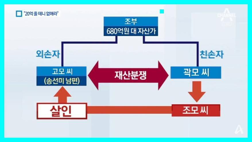 가해자는 송선미 남편의 외사촌 동생 곽모씨로 막대한 재산을 가진 자신의 친할아버지의 유산을 독차지하기 위해 먼 인척인 법무사를 끌여들여 유언장을 조작하려 했다가 할아버지가 이 사실을 알게 되자 사실을 바로 잡으려던 송선미 남편에게 앙심을 품고 그를 살해한 것인데요.
