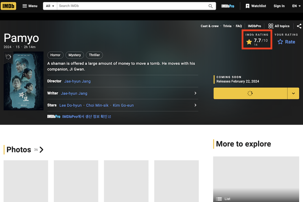 파묘 평점은 IMDb에 들어가서 확인해 보니 아직 리뷰 참여자수는 적지만 그래도 10점 만점에 7.7점이라는 나쁘지 않은 점수대를 유지하고 있습니다.