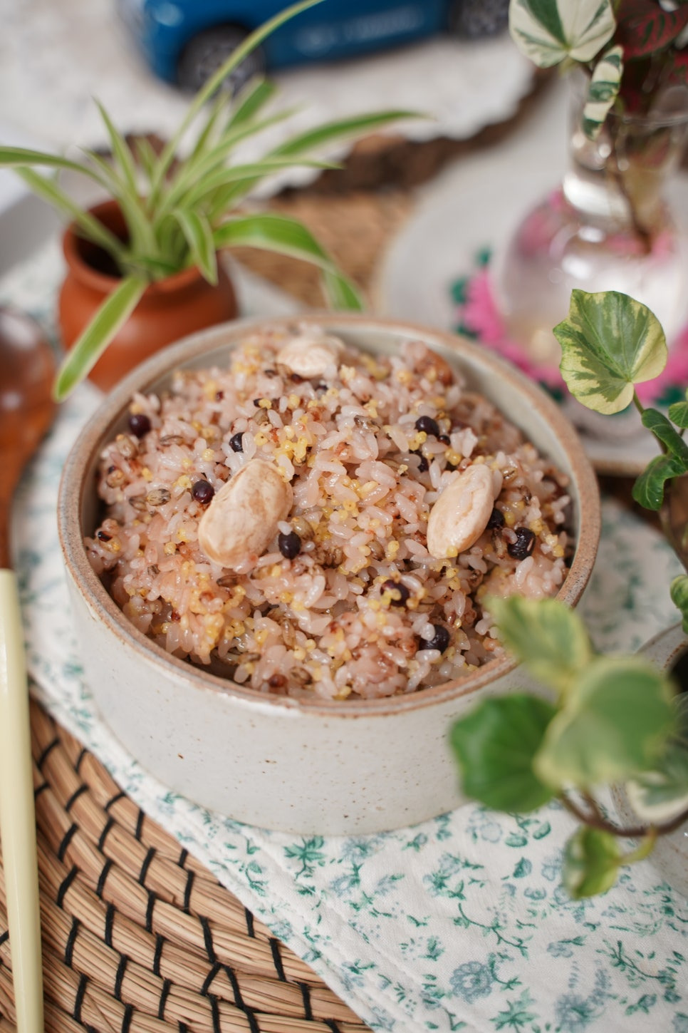 그 외 좁쌀, 찹쌀, 수수는 씻은 후 밥솥에 넣고 고루 섞어 팥 삶은 물과 정수를 섞어요. 불린 후 짓는 거라 평소보다 물양을 적게 잡고, 소금을 살짝 더해 밥을 지어줍니다.