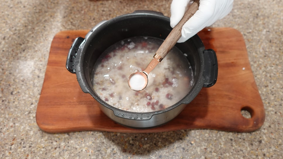 저는 정수를 부었는데 팥 삶은 물을 활용하시면 밥을 지었을 때 색이 더 진해져요.