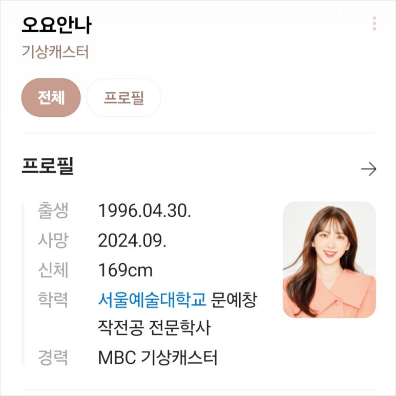이번 포스팅에서 어떻게 된 사연인지 알아보기에 앞서 오요안나 기상캐스터에 대해 잘 모르시는 분들을 위해서 오요안나 프로필을 먼저 알려드리겠다.