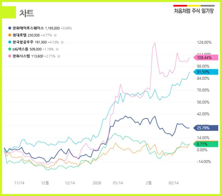 - 방산주 - 한화에어로스페이스, 현대로템, 한국항공우주, LIG넥스원, 한화시스템