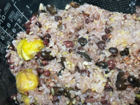 ※ 오곡밥의 색이 진한 게 싫다면 팥물을 넣지 않고 생수만 사용해도 된다.