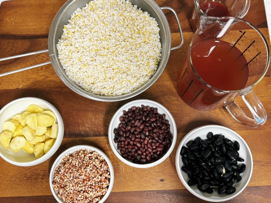 찹쌀 2컵과 맵쌀 1컵, 나머지 재료들은 모두 1/2컵을 준비한다.