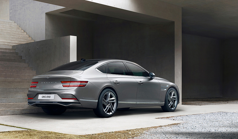 가솔린 모델이지만 외부로 돌출되어 있던 머플러를 히든타입으로 바꾸고 대신 하단범퍼 디자인에 약간의 굴곡을 두면서 제네시스 G80 만의 하라볼릭 라인을 더 강조할 수 있는 볼륨감 있는 범퍼형상으로 성형, 그리고 디퓨저 쪽도 제네시스 크레스트 그릴 디자인에서 착안된 크롬재질의 V형상을 담아내고 있는 모습입니다.