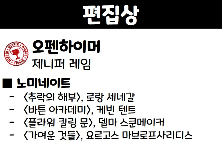 편집상은 <오펜하이머>의 제니퍼 레임이 수상했는데요. 이 부문도 일찌감치 수상자가 정해져 있는 것이나 다름없었죠. <유전>, <미드소마>, <결혼 이야기>, <테넷> 등을 작업했던 제니퍼 레임은 생애 첫 노미네이트에서 수상의 기쁨까지 누렸습니다.