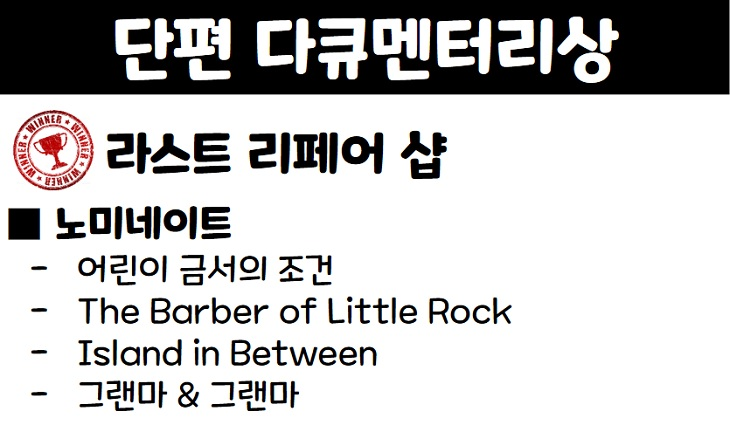단편 다큐멘터리상은 <라스트 리페어 샵>이 경쟁자 <어린이 금서의 조건>을 따돌리고 수상에 성공했는데요. 뉴욕 타임스의 예상이 맞아떨어졌네요.