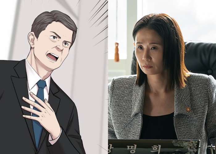원작 웹툰에서 보건복지부 장관으로 등장한 최필도(왼쪽)와 드라마에서 배우 김선영이 연기한 강명희 장관의 모습. 사진제공=네이버 웹툰·넷플릭스