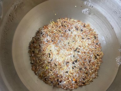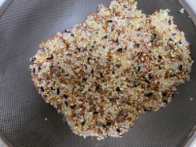 -기장이 물에 뜨니까 잡곡은 체에 밭쳐서 걸러내고 씻기를 반복해요.