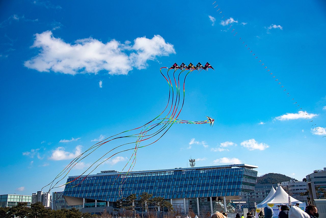 세종시청 위로 솟구치는 카이트 윙스와 줄연이 어울려 연날리기 축제의 분위기가 무르익었습니다.