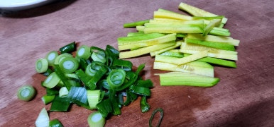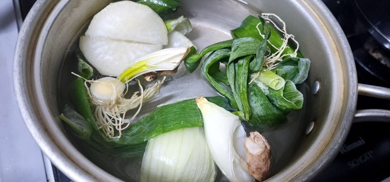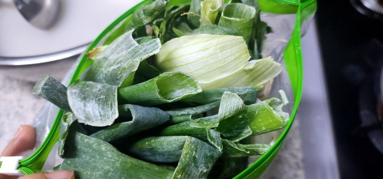 채소입니다. 대파와 뿌리, 양파 껍질,