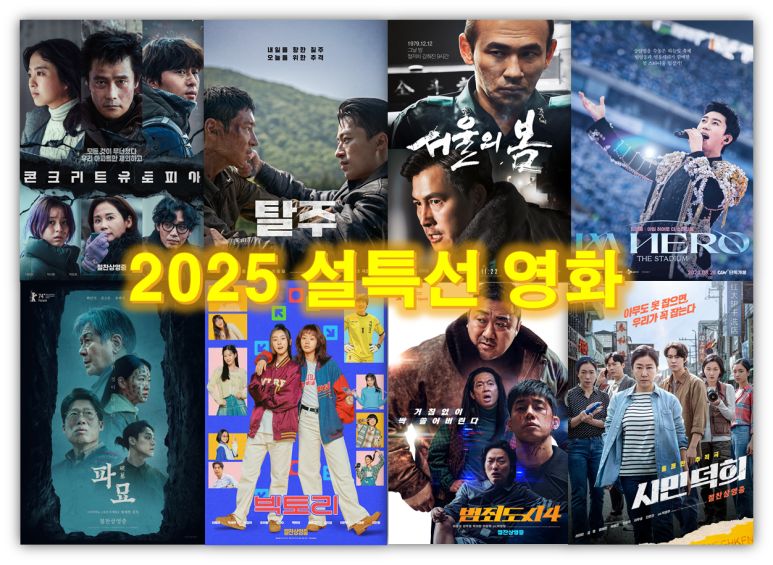 2025년 설 연휴가 긴 만큼 설특선 볼만한 한국 영화도 아주 풍성합니다. 최근 1년~2년 사이 개봉한 신작 영화들로 엄선한 8편을 추천합니다. 개인의 취향과 꼭 봐야 할 영화를 체크해 놓으시길 바랍니다.