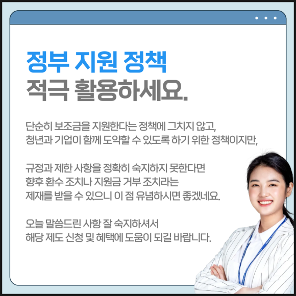 이 제도는 단순히 보조금을 지원한다는 정책에 그치지 않고, 청년과 기업이 함께 도약할 수 있도록 하기 위한 정책입니다.
